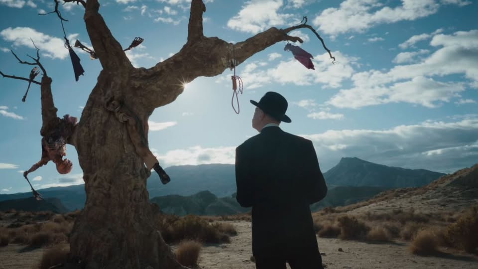 Cox initially plays Dead Souls with a straight face, but he begins to deconstruct the narrative midway through with post-modern games, meta twists and audience-winking allusions to his previous films. During an unexpected musical interlude, a singing corpse joins the cast to perform “The Streets of Laredo”, a country-folk murder ballad previously recorded by Johnny Cash, Willie Nelson, Joan Baez and others. A brief, bizarre flashback to Strindler’s childhood features Tim Burton-style stop-motion animation and a cryptic nod to the novel’s Russian-language roots. Most strikingly, a feverish dream sequence becomes a doomy prophecy of America’s current incarnation as a military-industrial surveillance state of AI, cryptocurrency and extreme inequality. These broad-brush political statements are hardly subtle but they feel uncomfortably necessary in the Trump era.