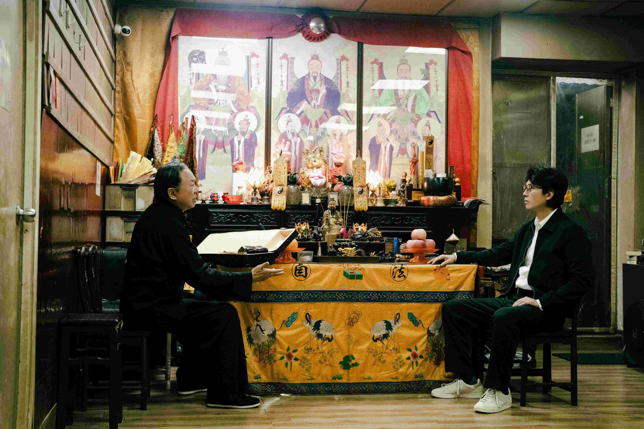The story twirls around Dominic, who has lost his business in the Covid shut-down and is casting around for work. Playing the tall, black-clad bachelor with glasses and a toothy grin, actor Dayo Wong teeters on the edge of comedy when his girlfriend’s Dad hooks him up with a revered but cantankerous priest known as Master Man. Veteran actor Michael Hui makes him the pinnacle of grump, so it comes as a surprise to see Dominic holding his own and persevering when Man devastatingly underlines his beginner’s mistakes. In Dominic’s mind, the priest is his 50-50 partner in the funeral business, but it will take Man the whole film to see it this way.